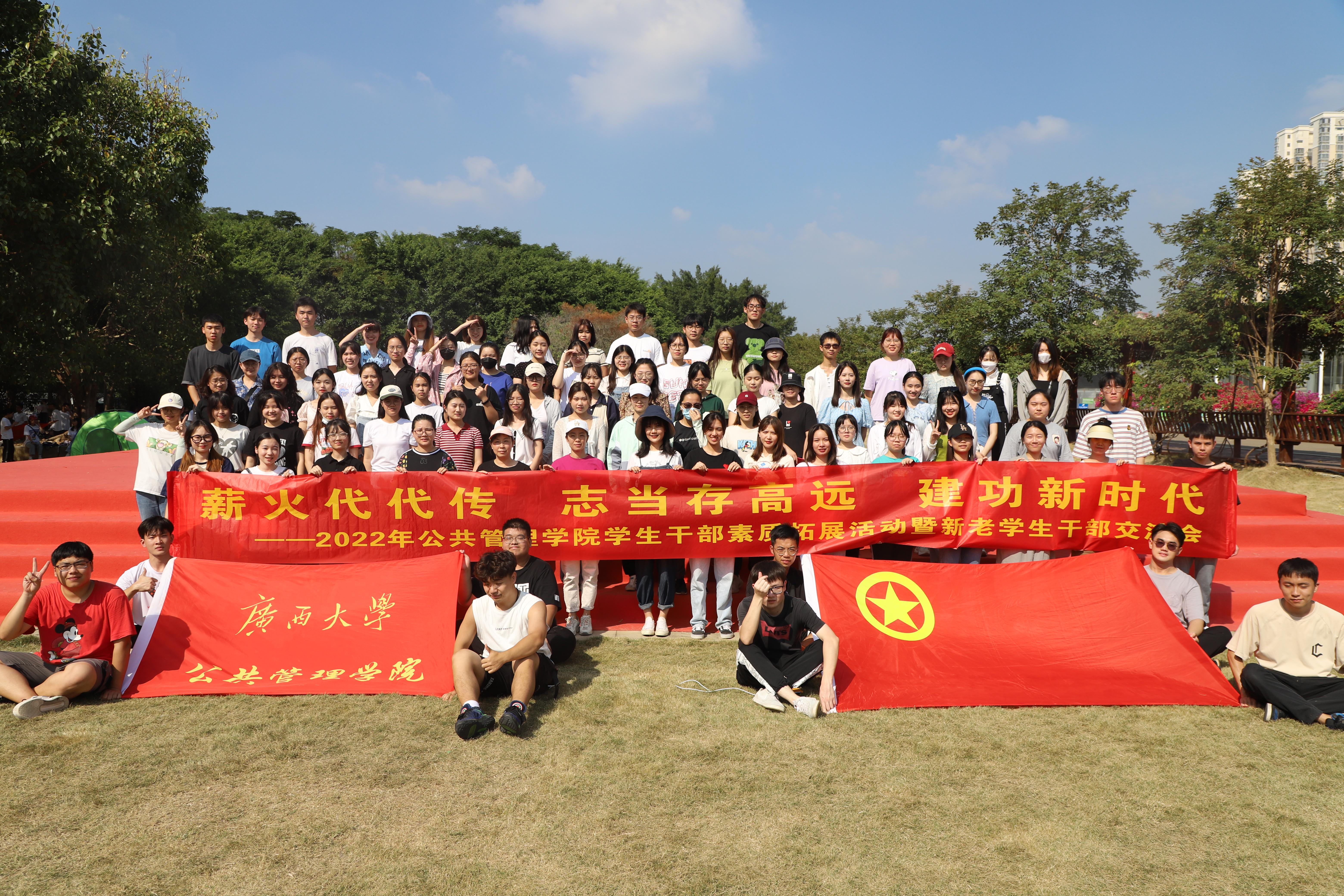 成人直播 于11月13日在八桂田园开展素质拓展活动暨新老干部交接仪式。学院19级至21级团委学生会干部代表、共进连连干代表、学院各班委代表、研究生会干部代表等参与活动。院党委副书记庞惠老师、院团委书记黄文静老师、院团委副书记刘佩瑶老师和辅导员侯俊丽老师受邀参加。