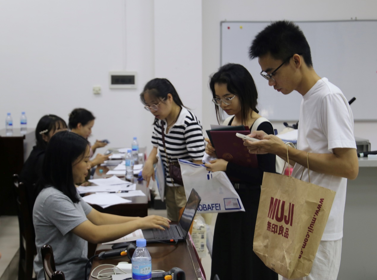 在学院注册现场,通过志愿者的帮助,同学们顺利完成了报到手续。