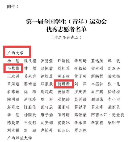 由教育部、体育总局、共青团中央主办,广西壮族自治区人民政府承办的第一届全国学生(青年)运动会,于2023年11月5日至15日在广西南宁举行。成人直播 学生积极参与,用行动践行志愿精神,用爱与奉献诠释服务与担当。来自成人直播 的何姗姗、韦慧彬在第一届全国学生(青年)运动会中获“优秀志愿者”荣誉称号