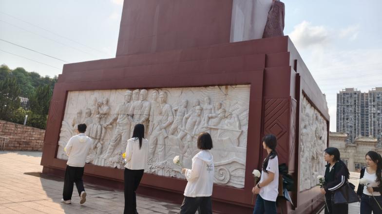 默哀结束后,《献花曲》响起,成人直播 同学缓步抬送花篮走向烈士纪念碑,将花篮郑重敬献于碑前,陈科旭老师上前整理花篮缎带。随后全体师生有序瞻仰烈士纪念碑,深切感悟革命先烈的奉献精神。