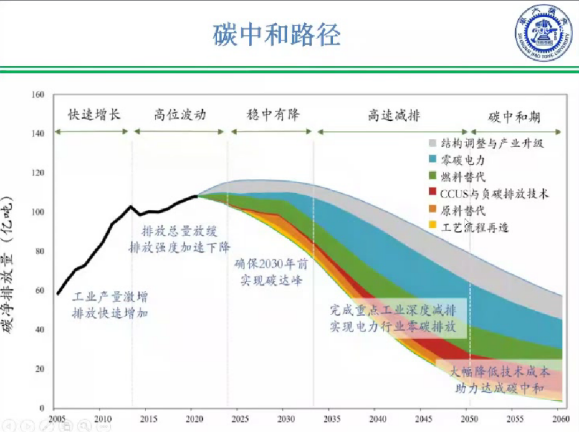 在介绍了全球的碳排放现状及影响之后,耿涌教授分享的重点转移到了中国碳达峰、碳中和的具体讨论上来。耿涌教授以再生能源、新能源汽车产业链等各行业的发展为例,分析了中国在能源结构、资源消耗、产品与贸易等方面的特征与挑战,并结合自身研究,提出了中国碳达峰、碳中和的实施路径。中国碳达峰、碳中和任重道远,但中国有望比任何发达经济体更早达到更低的峰值。