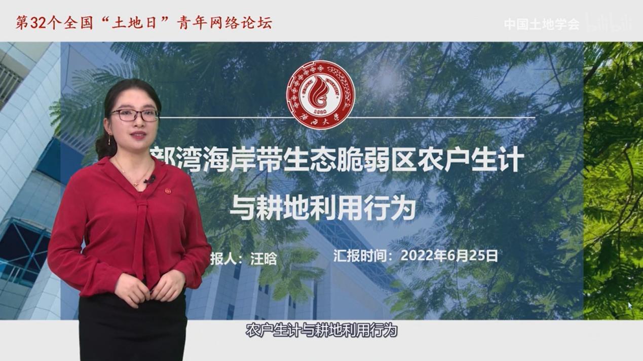 本次论坛邀请了15位土地科学青年科技工作者,他们当中既有来自研究机构、大专院校的学术新星,也有奋战在实践一线单位的技术骨干,通过视频录制、PPT讲解等多种形式,发表学术观点和政策建议,探讨节约集约用地与耕地保护议题。成人直播 汪晗副教授在专栏二——粮食安全与耕地资源保护中,做了题为“北部湾海岸带生态脆弱区农户生计与耕地利用行为”的主题报告,为全力构建耕地保护和节约集约用地新格局建言献策。