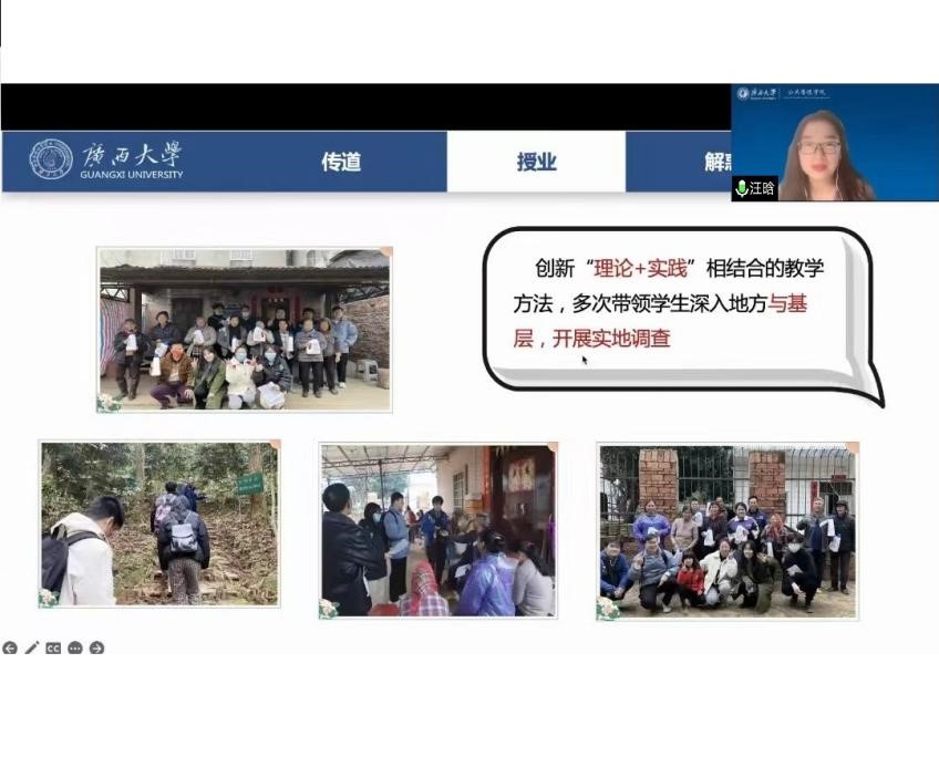 汪老师认为在教授学生科学知识之前,更应该教授学生成为什么样的人,并通过引用习近平总书记在全国高校思想政治工作会议上的原话,强调教师“立德树人”的重要性。在教学过程中,她结合《社会研究方法》课程特色,以“中国化理论体系”为纲,除了提升学生的社会研究能力之外,还构建学生的理论自信,激发他们对理论研究的兴趣,真正达到“以中国理论,讲中国故事”的课程设计初衷。