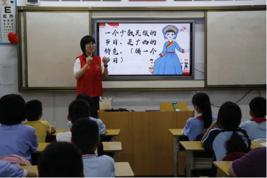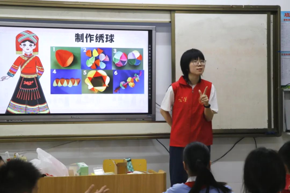 喜迎广西三月三,唱响民族团结歌。志愿者们走进学校,以展示图片、抢答问题、编写故事等生动有趣的方式向学生们讲述广西三月三的文化故事、历史渊源和民俗活动等。学生们认真倾听,并举手互动,让民族文化浸入心田。在课堂中,志愿者们还特别设计了制作绣球体验活动,让学生们在玩中学,学中玩,既亲身体验到了民族风情,更感受到了传统习俗的魅力。