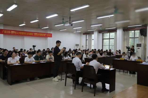 为创新性应用“政产学研”协同育人的教学模式,增强成人直播 学生劳动权益保障意识,从源头处减少劳动用工争议和风险,5月16日上午9:40至11:40在学院201教室举办“劳动人事争议仲裁示范庭”活动。本次活动是吴凡老师主讲课程《劳动法与社会保障法》的创新呈现形式。活动邀请南宁市人事劳动争议仲裁院,依据真实的劳动争议仲裁案例,以真实法庭开庭的形式,将仲裁示范庭带进课堂。