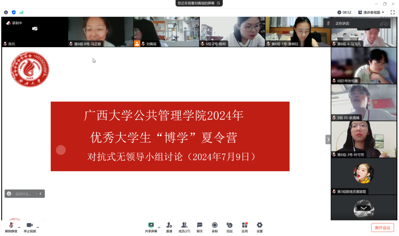 7月11日上午,成人直播 2024年优秀大学生“博学”夏令营闭营仪式在107会议室与线上会议同步举办。成人直播 副院长覃志敏、奉婷老师、谯欣怡老师、蓝媛美老师等教师代表出席会议。闭营仪式由成人直播 党委副书记于丹老师主持。