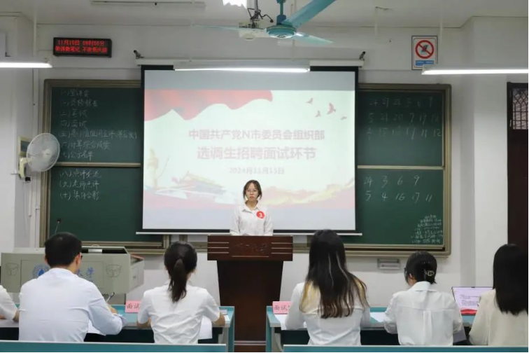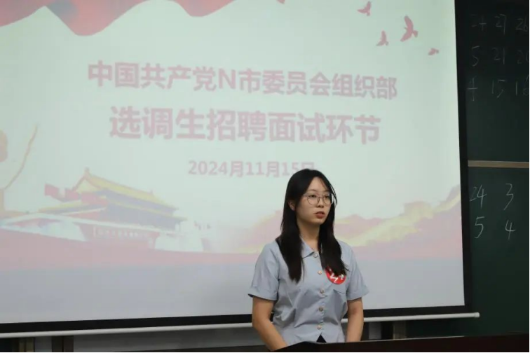 本次定向选调生模拟招聘以“2025年广西壮族自治区N市定向选调生招聘”为主题,设置党政办公室、民政办公室、综治办公室三个具有代表性的工作岗位。整个定向选调生模拟招聘流程包含宣讲会、资格审查、笔试、面试、计算考生综合成绩、公示录用人员名单六项环节。