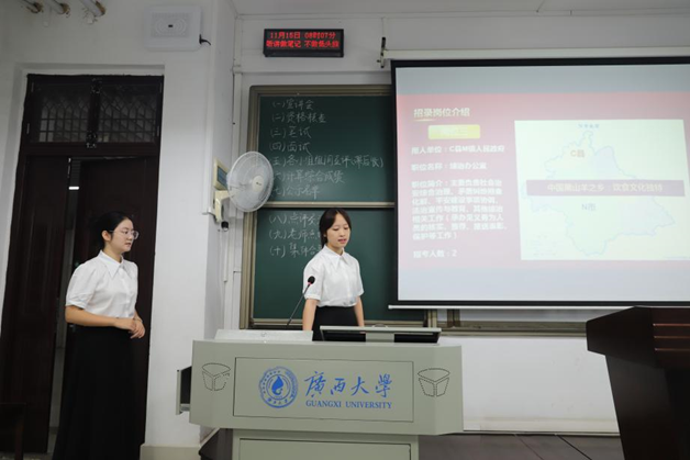在宣讲会环节,宣讲人王露、李若源分别从地区情况、配套政策、招录介绍、选调程序四个方面对N市选调生招聘进行了全面而详细地介绍,帮助报考定向选调生的学生熟悉选调生招考基本情况。