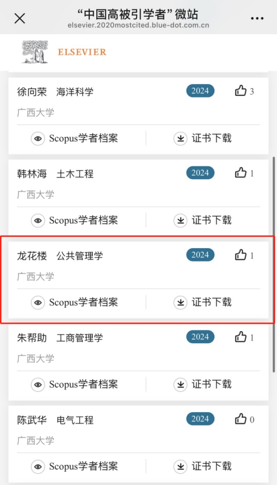 近日,全球性信息分析公司爱思唯尔(Elsevier)正式发布了2024“中国高被引学者年度榜单”,成人直播 龙花楼教授再次入选榜单,这是龙花楼教授自2021年起连续四年入选该榜单。