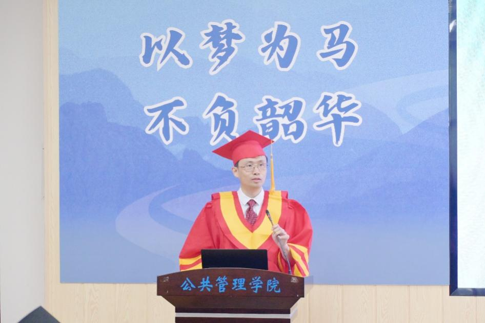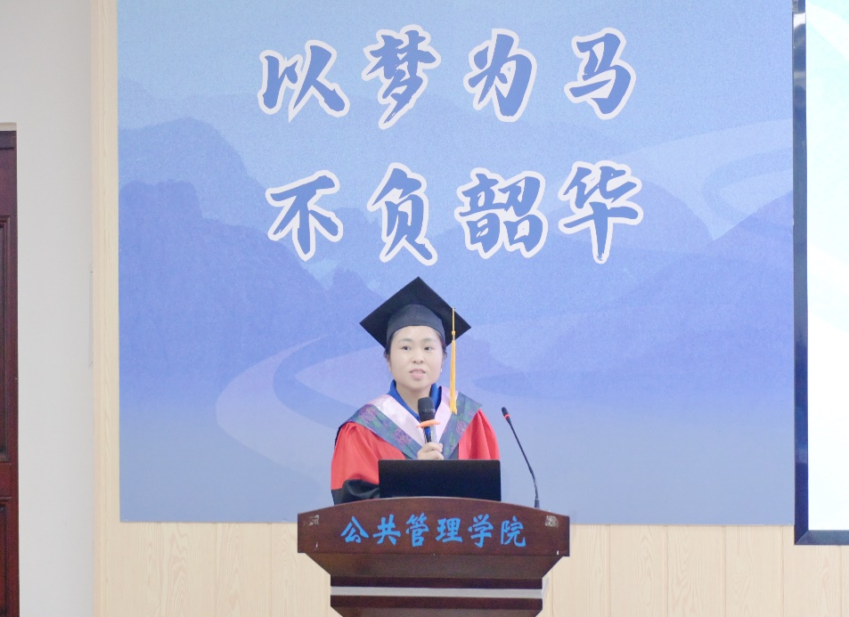 在校生代表王瑞贤向即将毕业的学长学姐致以诚挚祝贺与感谢。她表示,学长学姐们是学习的榜样,其平衡工作与生活的智慧、对公共管理初心的坚守,都给予他们深刻的启迪与力量,激励公管学子继续在公共管理领域砥砺前行。
