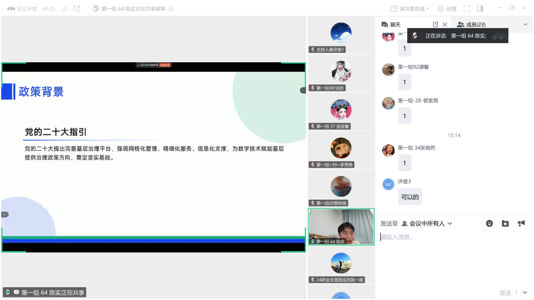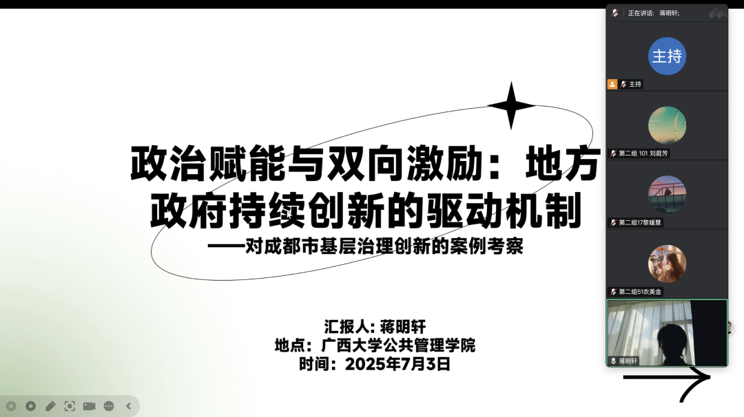 7月4日上午,夏令营总结环节在线上线下同步开展。营员代表进行了学习成果汇报,成人直播 王韬、谯欣怡、陈潇潇三位老师受邀担任点评嘉宾出席。汇报中,同学们围绕资源利用与城乡协调发展、数字技术赋能社会治理、特殊群体生计与健康保障等方向展开阐述,既有在理论或方法层面的创新探索,也有对现实问题的深入思考。现场气氛热烈,老师与营员们关于研究话题、研究细节等内容进行互动交流。作为夏令营的重要环节,这场汇报展示了同学们的学术积累,更通过真诚深入的交流碰撞,为大家打开了新的研究思路,它让整个夏令营的学习氛围更加浓厚,也让同学们对专业研究的热情愈发高涨。