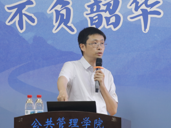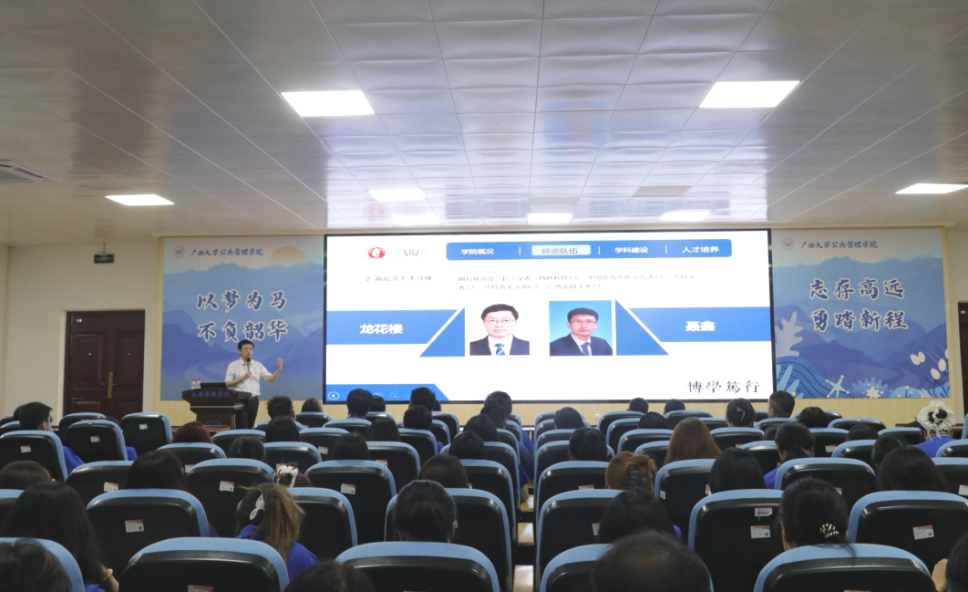 聂鑫围绕学院历史沿革、学科建设、人才培养等方面展开介绍,并对在座新生提出三点要求:第一是依托院校资源,扎根专业学习。聂鑫指出,学院汇集了一支由龙花楼教授带领的高水平学者队伍,围绕广西高质量绿色发展等特色命题,开展了系列边疆治理合作研究,取得丰富的科研成果,在社会科学研究领域中展现出了广泛的影响力。他建议同学们虚心求教,刻苦求学,用专业知识丈量八桂大地,怀公管初心绽放青春力量。第二是学习优秀榜样,确立人生目标。聂鑫强调,成人直播 制定了“五色花”党建育人工作体系,旨在通过多层次、全过程、精细化的人才培养机制,帮助同学们学有所成,学有所就。他向新生们分享成人直播 往届优秀学子在科研、升学及就业方面的卓越表现,鼓励同学们确立人生规划,汲取榜样力量。第三是拥抱科技时代,同频时代发展。聂鑫结合自身在人工智能领域的学习实践经历,指出培养数字思维能力、数字素养能力与数字分析能力的重要性,希望同学们以人工智能赋能大学学习,将专业知识融入AI赛道,乘科技之风探索学科发展新可能,在跨界融合中拓宽成长新路径。