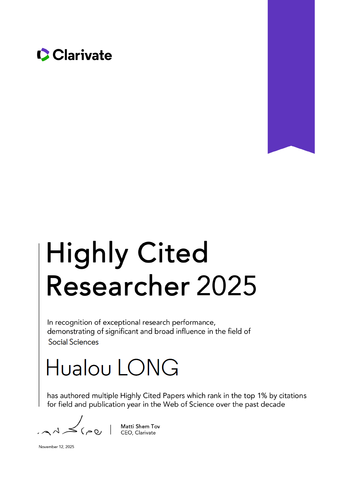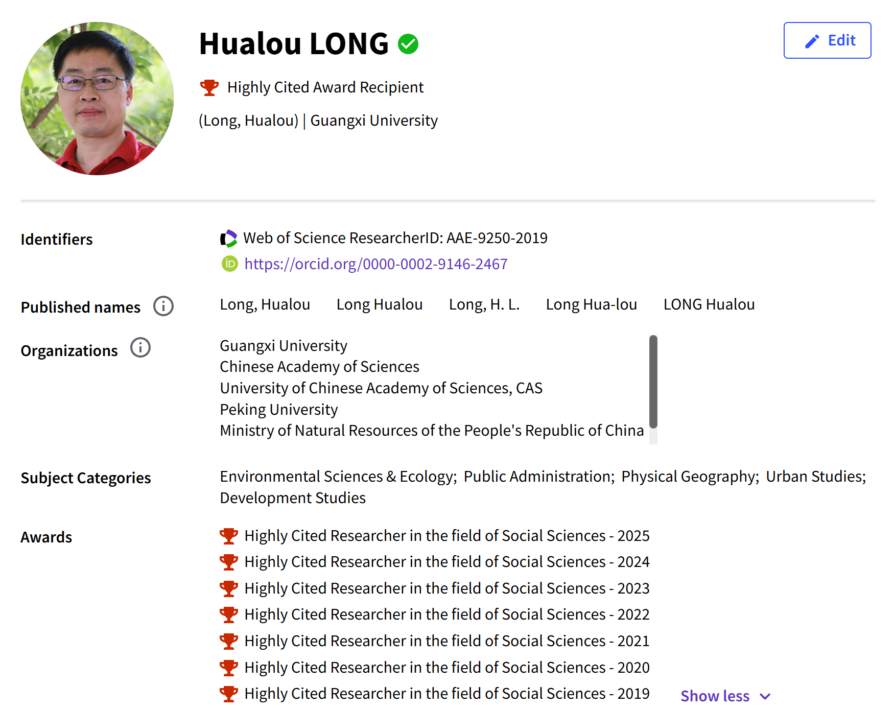 继2019年入选该榜单以来,成人直播 土地资源管理系龙花楼教授再度连续入选社会科学(Social Sciences)领域的全球“高被引科学家”。2025年榜单中,龙花楼教授是成人直播 在该榜单中唯一入选者。