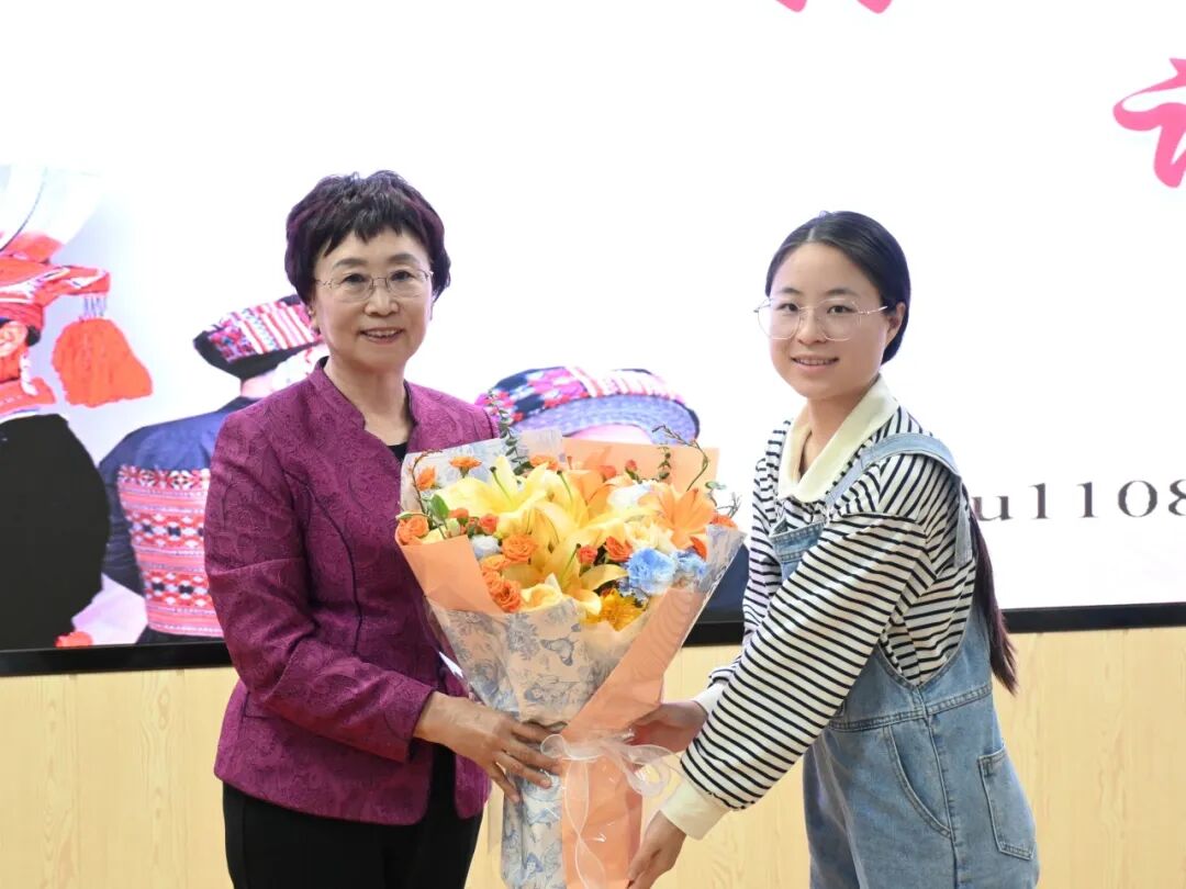报告结束,同学为于瑮送上鲜花并表达由衷的敬意与感谢。