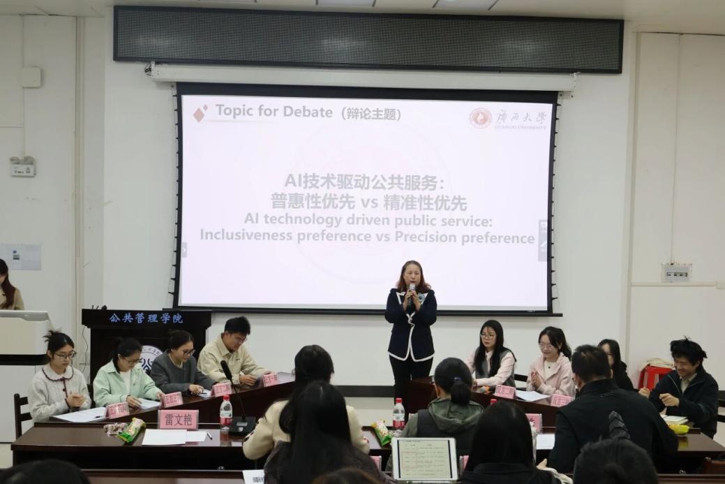 2025年11月20日,成人直播 101教室座无虚席,一场聚焦“AI技术驱动公共服务:普惠性优先vs精准性优先”主题的全英文辩论赛激战正酣。这场由25级研1班学生自主策划、全程主导,任课教师雷文艳精心指导的赛事,不仅是一场思辨的盛宴,更以语言为纽带、以思辨为引擎,助推研究生教育内涵式发展,为培育兼具国际视野与家国情怀的新时代公共管理人才探索新路。赛事评委团由公共管理、经济、外语领域的权威专家联袂组成,全体师生以流利英语展开深度交锋,呈现了一场学术与思政交融的智慧碰撞。