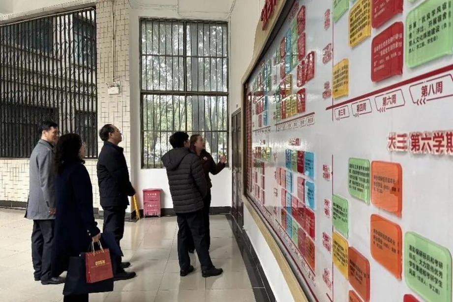 代表团来到学院“五色花”党建文化展示墙前,参观学院党建工作与人才培养深度融合的特色实践阵地。雷文艳以“五色花”育人工作体系为核心,向代表团生动介绍了这一特色鲜明、成效显著的育人模式。该体系以立德树人为根本目标,通过“红青金橙蓝”五大工程,系统落实价值引领、成长培育、实践奉献、人文关爱、品行涵养五大举措,构建起以学生个性发展为导向、分层次、全过程、精细化的育人体系。代表团对学院这一体系化的育人创新实践给予了充分肯定与高度评价。