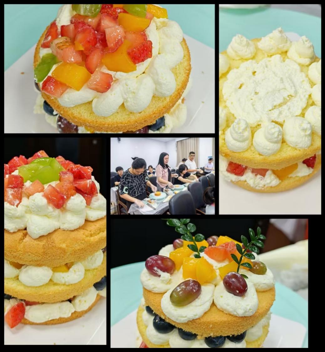 首先,专业烘焙老师进行了现场教学,细致讲解了蛋糕抹面、裱花、装饰等技巧,为接下来的创意制作做好了充分准备。在“甜蜜创作”环节,女教职工们化身巧手“烘焙师”,充分发挥想象力与创造力,认真地为蛋糕胚涂抹奶油,精心搭配各式新鲜水果和可爱装饰。活动现场充满了欢声笑语,大家互相交流技巧、分享生活趣事,在协作与互动中增进了彼此的情谊,平日里忙碌的身影此刻都沉浸在专注创作的幸福之中。经过一个多小时的精心制作,一个个独具匠心、精致可爱的DIY蛋糕陆续诞生。最后,大家开心地展示着自己的劳动成果,并合影留念,用镜头定格了这份甜蜜与美好。