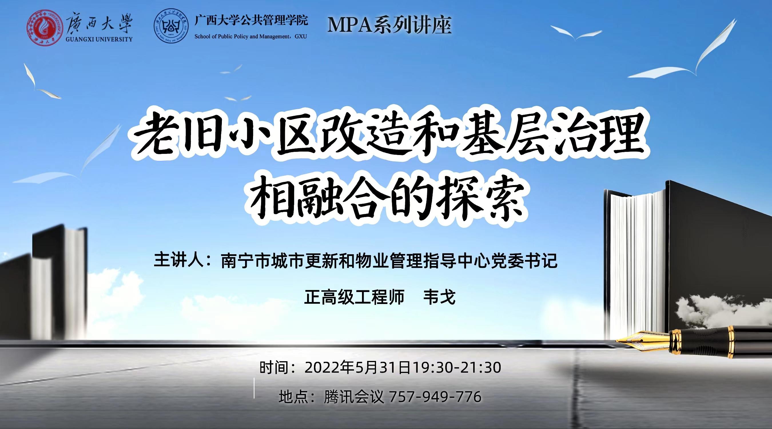 5月31日晚,成人直播 成功举行“老旧小区改造和基层治理相融合的探索”主题讲座,是MPA系列讲座之一。本次讲座的主讲嘉宾南宁市城市更新和物业管理指导中心党委书记、正高级工程师韦戈。成人直播 副院长周均旭教授主持本次讲座。讲座通过腾讯会议线上进行,学院200余名师生参加。