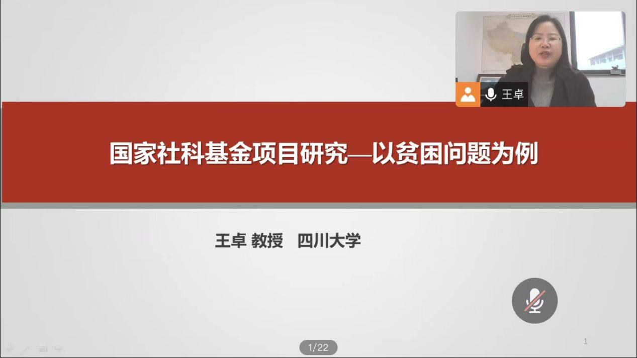 2月15日下午,四川大学成人直播 王卓教授受邀参加成人直播 公管名师大讲堂,作题为“国家社科基金项目研究—以贫困问题为例”的线上主题讲座。讲座由成人直播 党委委员、副院长魏万青教授主持,副院长周均旭教授、熊斌教授、黎昌珍教授、叶大凤教授、王巨光教授等老师,以及成人直播 博士、硕士研究生等百余名师生参加了本次学术讲座。