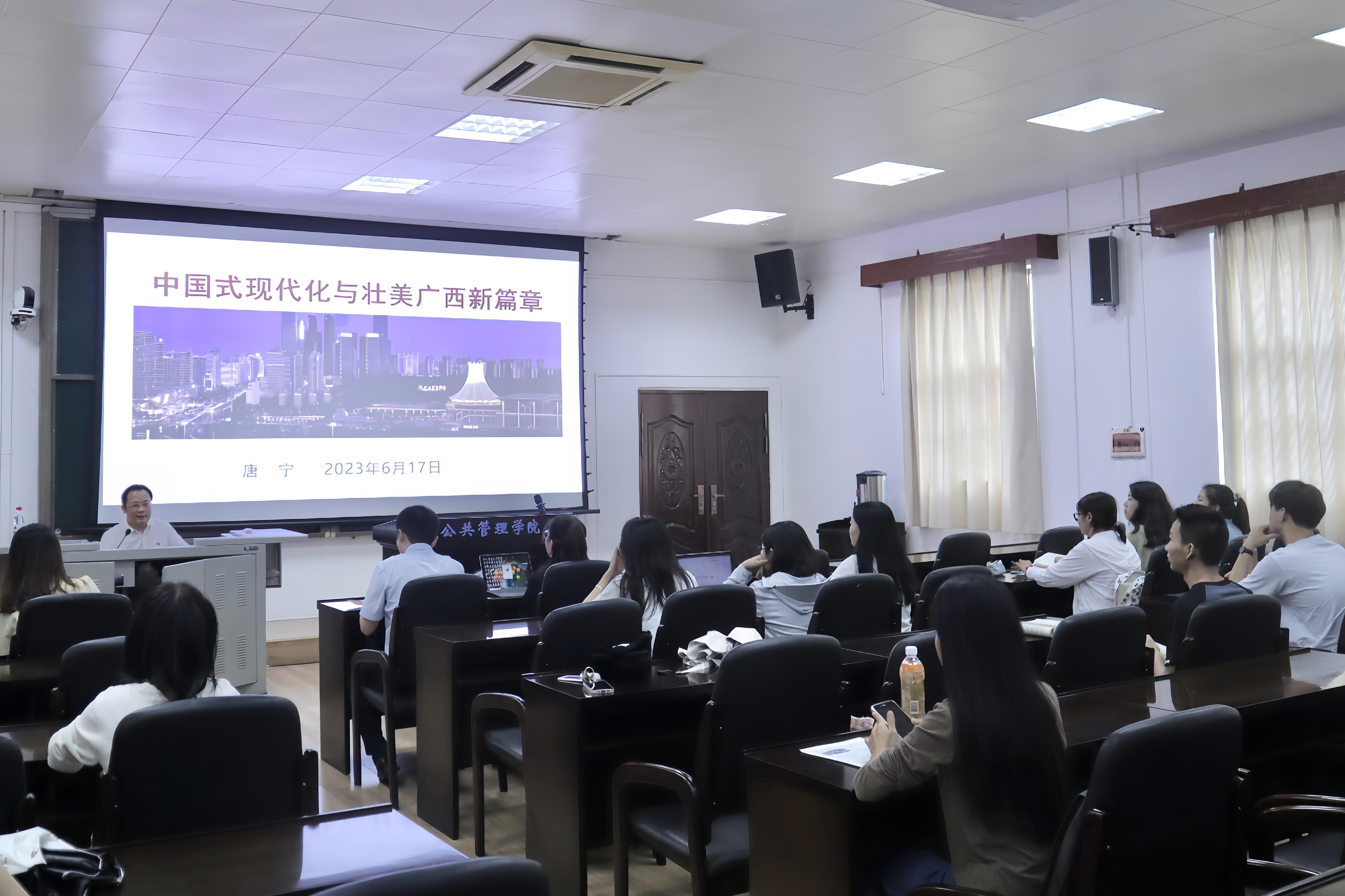 6月17日下午,自治区决策咨询委员会专家、博士研究生导师唐宁研究员受邀于成人直播 107报告厅作“中国式现代化与壮美广西新篇章”主题讲座。本次讲座由成人直播 党委书记聂鑫主持,校党委统战部部长姚作芳及成人直播 众多研究生、本科生参加了此次讲座。