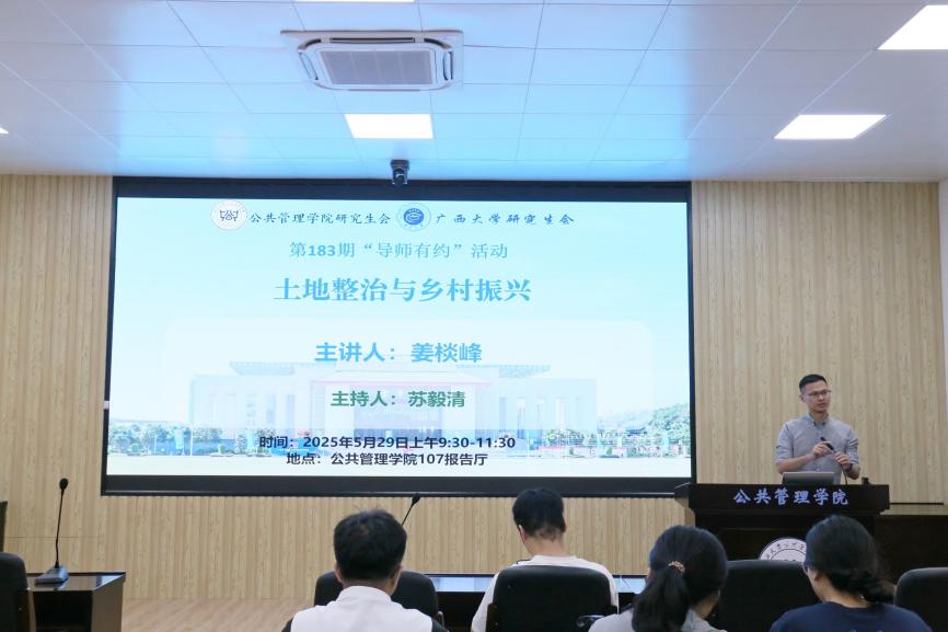 5月29日上午,成人直播 第183期 “导师有约” 系列活动暨成人直播 研究生第46期学术沙龙活动在学院107报告厅顺利举行。本次活动主题为“土地整理与乡村振兴”,特邀姜棪峰老师为主讲人,旨在深化广大师生对国家土地政策与乡村振兴战略的理解,探讨如何发挥土地整治在促进乡村振兴上的重要作用。