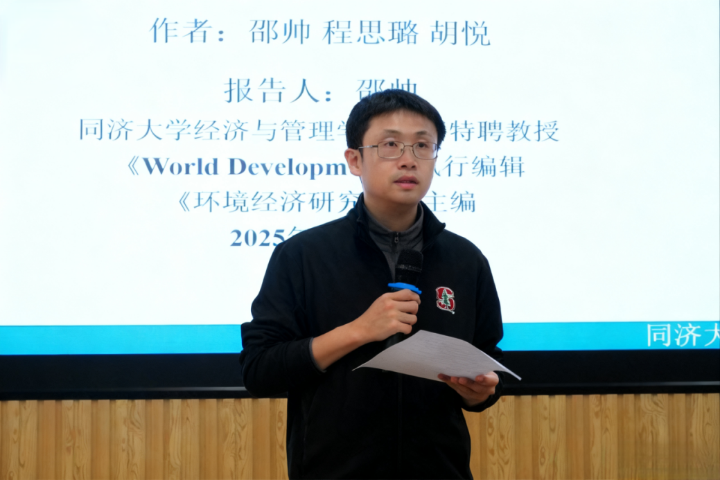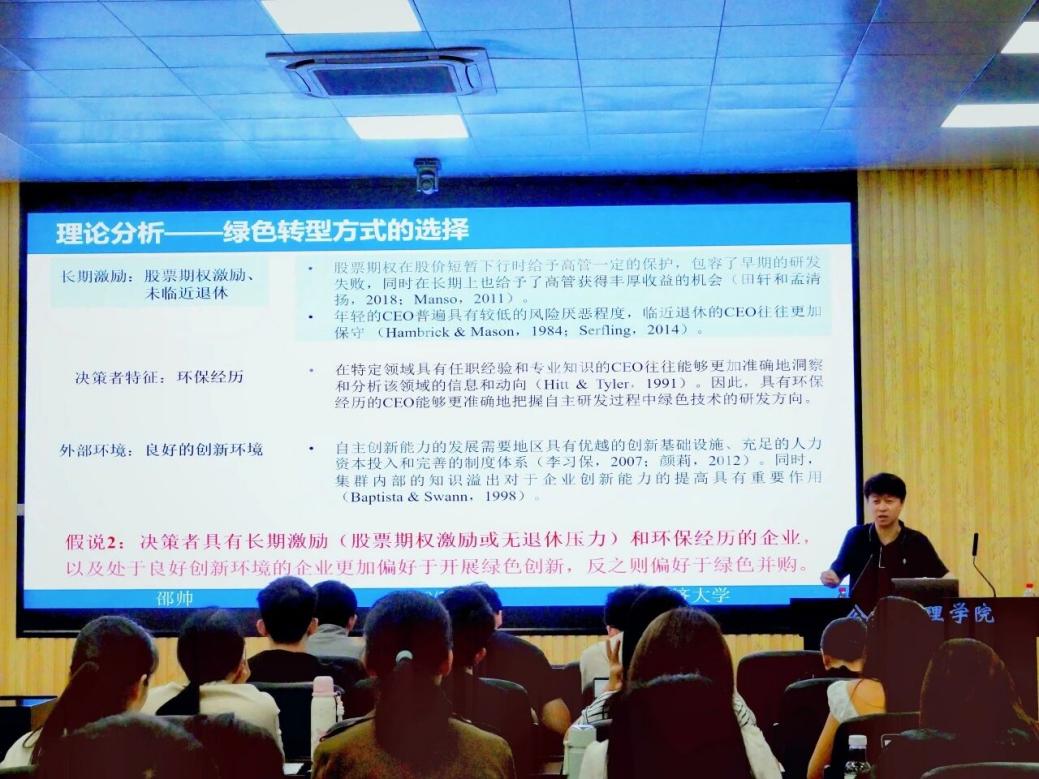 11月1日上午,同济大学经济与管理学院特聘教授邵帅受邀于成人直播 107报告厅开展题为《顺势而为还是随机应变:理解碳减排政策下的企业绿色转型决策》的专题讲座。本次讲座由成人直播 院长聂鑫教授主持,副院长曾凡军教授出席本次讲座,吸引众多博士、硕士研究生到场聆听,讲座现场座无虚席,与会者热情高涨,学术交流氛围十分活跃。