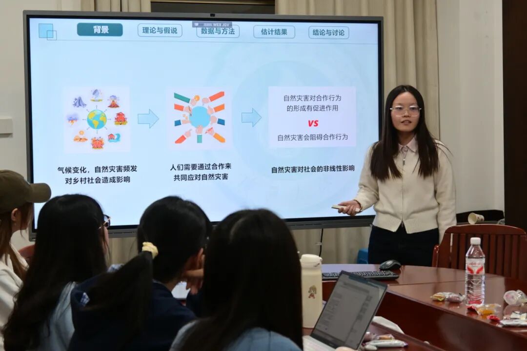 曾群棋同学则围绕《自然灾害对集体行动的非线性影响——基于中国边疆地区的证据》展开分享。她依托成人直播 2023年边疆地区“百村千户”调查数据,运用组合IAD-SES框架,重点剖析自然灾害与集体行动的内在关联,并提出二者存在“倒U型”非线性关系的核心观点:中小灾害可成为打破村庄僵化结构的“机会之窗”,通过推动资源重组与社会学习提升集体行动水平;而大规模灾害则会因资源耗竭、社会网络破坏,导致系统陷入“贫困陷阱”,进而抑制集体行动。为进一步验证该结论,她将集体行动划分为预防型和应对型两类,通过工具变量法及系列稳健性检验,充分证实了这一非线性关系的稳定性,并基于此提出分等级灾害治理的针对性政策建议。