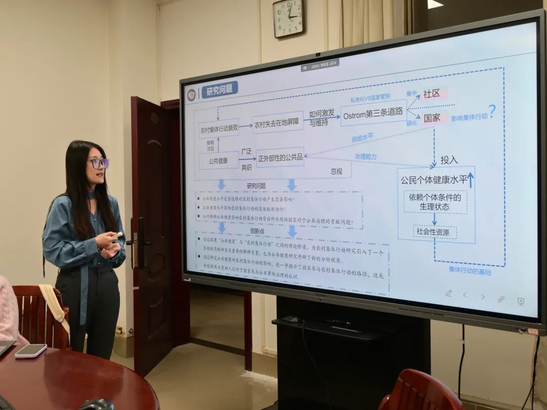 王雪薏同学以《公共健康对农村集体行动的影响及其背后国家参与公共治理逻辑》为主题展开分享。她基于2020年中国家庭追踪调查数据,运用Probit模型、广义结构方程模型等多元研究方法,系统性探究了公共健康水平对农村集体行动的影响效应及内在作用机制。她提出“挤出—转换—返还”的核心运行机理,深度阐释了国家通过制度设计将私人利益整合并转化为公共利益,进而促成农村集体行动形成可持续发展动态闭环的内在逻辑;同时,研究从客观健康与主观健康双维度开展实证检验,证实了健康水平对农村集体行动存在显著的正向促进作用。