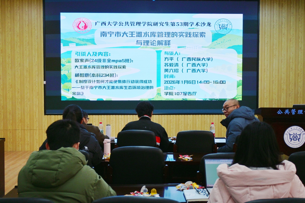 2026年1月6日下午,成人直播 暨广西高校人文社会科学重点研究基地——区域社会治理创新研究中心第五十三期学术沙龙在学院107报告厅成功举行。本期沙龙聚焦“南宁市大王滩水库管理的实践探索与理论解释”主题,由24级非全日制硕士研究生欧家声、23级本科生杨如意担任引谈人,方平、苏毅清、黄六招三位老师担任与谈人。讲座深化了师生对相关领域的研究认知,吸引了全院众多师生参与。