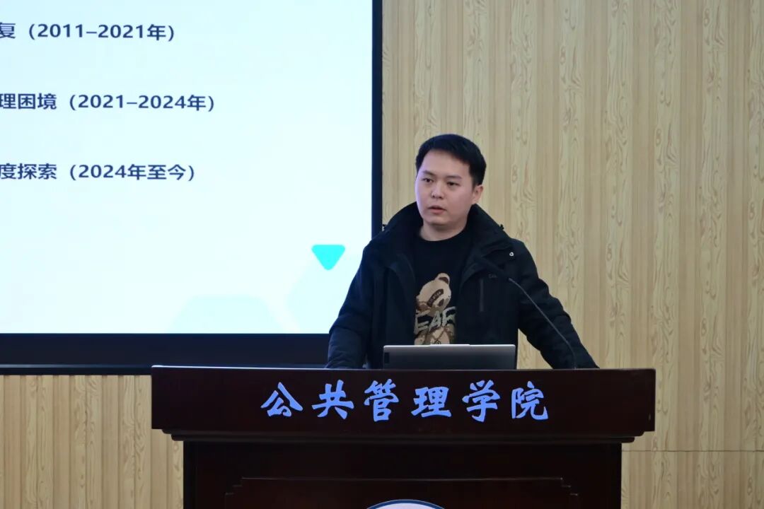 杨如意同学分享的论文题为《制度设计如何才能使集体行动获得成功——基于南宁市大王滩水库生态环境治理的案例》。研究聚焦制度设计如何使集体行动获得成功的问题,构建了多层级社会生态系统互动分析框架,系统诊断了大王滩水库不同治理阶段的制度设计成效,提出了以"挤出-转化-返还"为核心的制度设计过程。