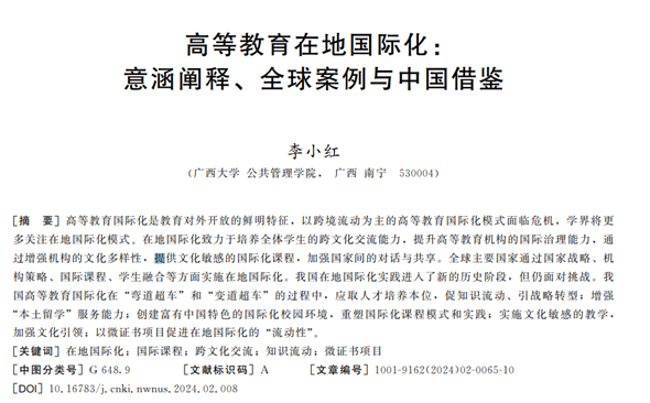 近日,成人直播 副教授李小红在《西北师大学报(社会科学版)》发表论文“高等教育在地国际化:意涵阐释、全球案例与中国借鉴”,对高等教育意涵及在全球范围内的经典案例进行了解读,探讨了高等教育在地国际化的实践策略和中国路径。