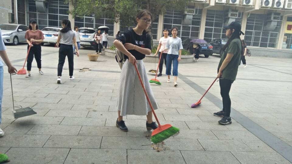 活动前,同学们准备了扫帚、簸箕、抹布等工具,根据清扫区域进行分组;,一个多小时的活动期间,同学们各司其职、相互合作并一直充满热情的打扫广场和湖边小路的烟头、落叶等垃圾,并用抹布搽干净了花坛外围,给路人提供了一片干净的休息地。