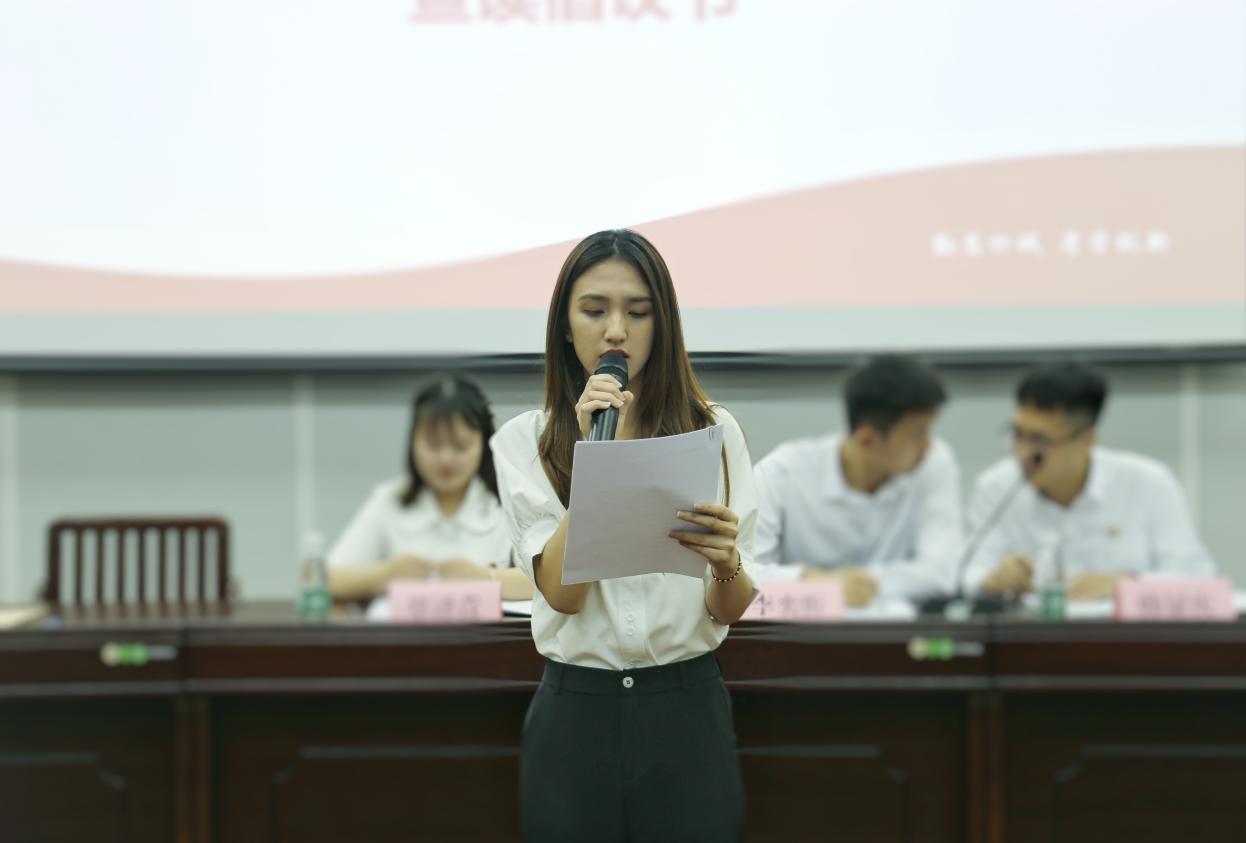 新任主席团成员代表粟钰清宣读倡议书,向成人直播 研究生发出倡议:一是要志存高远,厚植家国情怀;二是要明德至善,锤炼坚毅品格;三是要勤学求知,增强创新意识;四是要奋发有为,砥砺使命担当。
