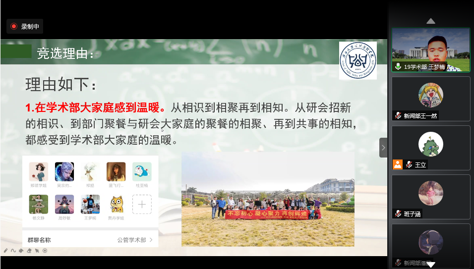 接着是会议的主要议程——竞选演讲,演讲通过竞选人抽签后进行线上展示的方式进行,每人有3-5分钟的展示时间。一共有16位同学参与竞选,他们分别是黄兴、王梦楠、陈娅、蒋文倩、潘懿、杜亚楠、陈美合、郭凯、吴天赐、班子涵、刘含笑、祁拯、蒋春艳、杨媛媛、王梅和陈旭(按发言先后顺序)。这16位同学竞选的职位包括主席、副主席、学生会助理团以及各部门部长等。参与竞选的同学表达了对研会的热爱与工作热忱,介绍了自己丰富的工作经历并指出了自己的竞争优势,还畅谈了对于未来研会工作流程优化和工作质量整体提升的期待,并对现任主席、部长等研会核心成员对自己的无私帮助和精神鼓励表达了感谢。