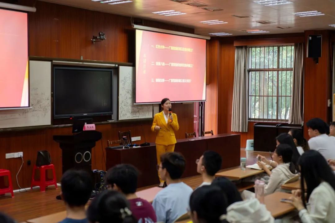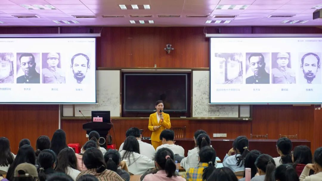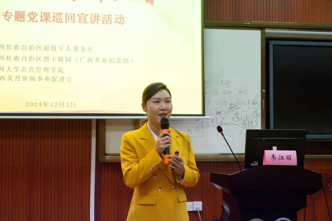 为进一步促进青年学生知党爱党,用党的奋斗历程和伟大成就鼓舞斗志、明确方向,用党的光荣传统和优良作风坚定信念、凝聚力量,用党的实践创造和历史经验启迪智慧、砥砺品格,12月3日,成人直播 于学院201教室开展“党史铸魂,精神立骨”专题党课宣传活动,本次巡回宣讲的主题是“星火初照——中国共产党早期组织在广西的建立”,邀请到广西革命纪念馆的韦江丽老师担任主讲。成人直播 党建会部分党员和共进连全体连员参与本次活动。