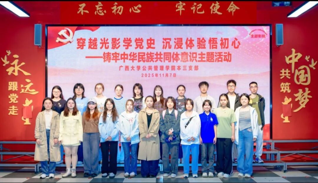 为创新模式开展形式多样的主题党日活动,促进党史学习教育常态化长效化,深化铸牢中华民族共同体意识教育,11月7日,成人直播 本科生第三党支部组织全体党员前往南宁盛天上影电影党建教育基地,开展以“穿越光影学党史 沉浸体验悟初心 ”为主题的党日活动,让红色教育从“被动接受”变为“主动体验”。