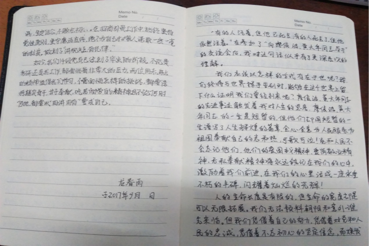 本科第三党支部切实将学习活动融入到生活中。本三支部党员在廖俊波和黄大年的组织生活会后,通过流动日记的形式,进行更持续而深入的思考和感悟,均对自己进行了反思。除了对两位同志表达敬仰之外,更重要的是要以两位同志为镜,学习做人做事,传承和发扬他们的政治品质、公仆情怀、敬业精神和崇高品格。