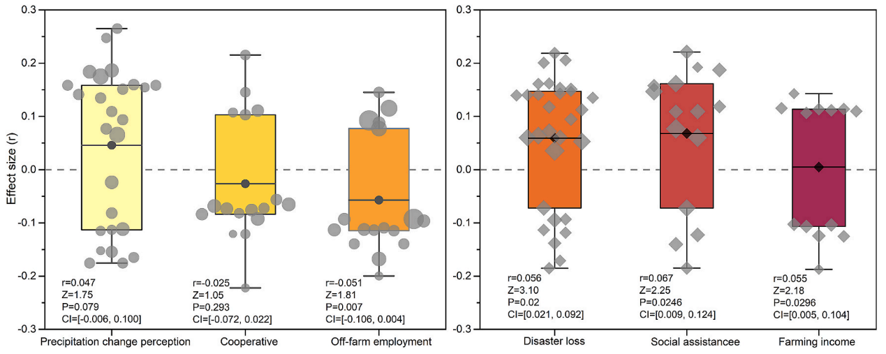 Empirical findings show that farmers often have inaccurate perceptions of precipitation changes, while psychological factors such as perception, experience, and risk attitudes significantly positively influence their adaptation behaviors (Figure 2). The high heterogeneity in climate change perceptions is largely driven by differences in climatic regions, indicating that the influence of climatic regions may moderate and weaken the positive relationship between climate change perception and adaptation behavior. The study also highlights the importance of implementing household-level interventions to improve farmers' ability to adapt to climate change. This can be achieved through support measures like income diversification, early warning information services, training, assistance, credit, subsidies, and other resources. Future research should delve deeper into understanding the mechanisms by which perception, experience, and risk interact to shape adaptation behaviors.