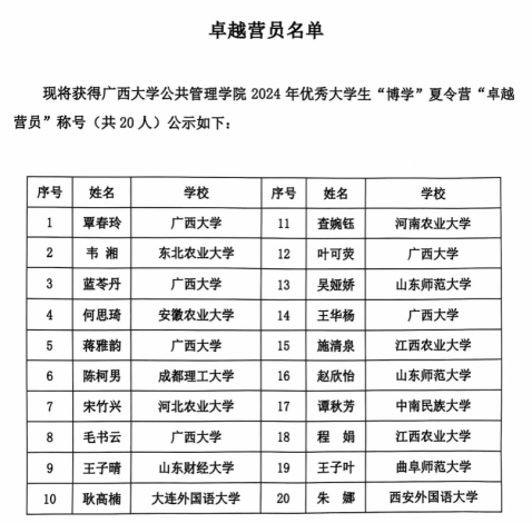 To foster communication and interaction among top students from various universities and to enhance their understanding of the public administration discipline and the School's cutting-edge academic developments and achievements, Guangxi University's School of Public Policy and Management successfully held the 2024 "BoXue" Summer Camp from July 9 to 11. After a rigorous selection process including qualification reviews, material assessments, and comprehensive evaluations, 60 elite students from 23 universities—such as South China Normal University, Northeast Forestry University, Guangxi University, Guangzhou University of Chinese Medicine, Xiangtan University, Chengdu University of Technology, Shanghai University of Electric Power, Sichuan Normal University, and Anhui Agricultural University—were chosen as official participants. The three-day camp was highly praised by attendees, who reported a fulfilling and enriching experience.